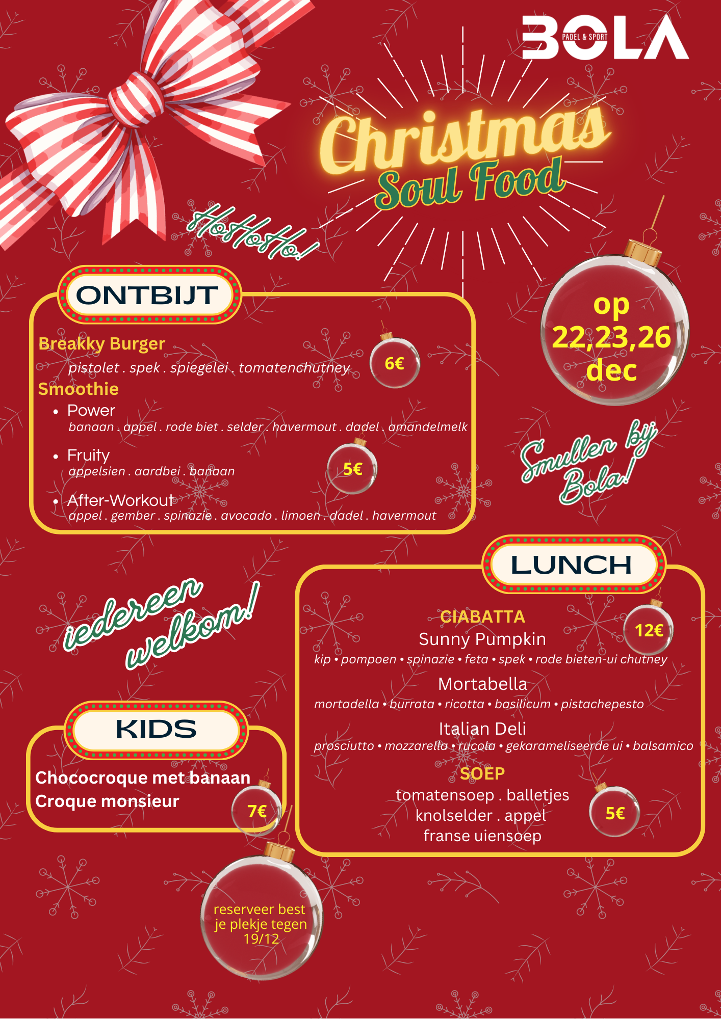 Ideaal voor die boost voor of na je padel match, voor wie wil genieten van die luilekkere kerstdagen of gewoon voor wie Bola eens wil komen ontdekken! Allen welkom!
